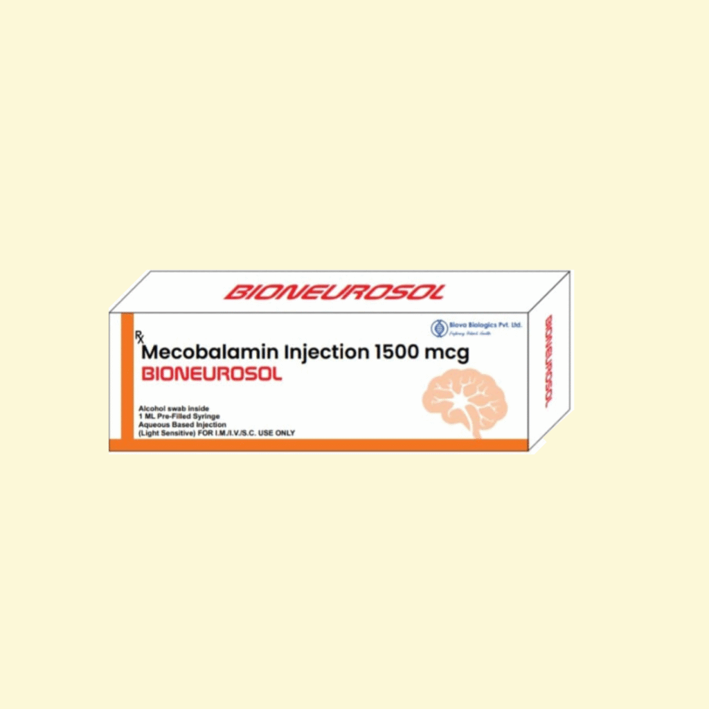 Bioneurosol Mecobalamin Injection 1500 mcg is a prescription-strength Vitamin B12 formulation designed to support healthy nerve function, red blood cell formation, and overall neurological well-being. Each pre-filled 1 mL syringe contains 1500 mcg of Mecobalamin (active form of Vitamin B12) in an aqueous base, ensuring effective absorption and quick action.